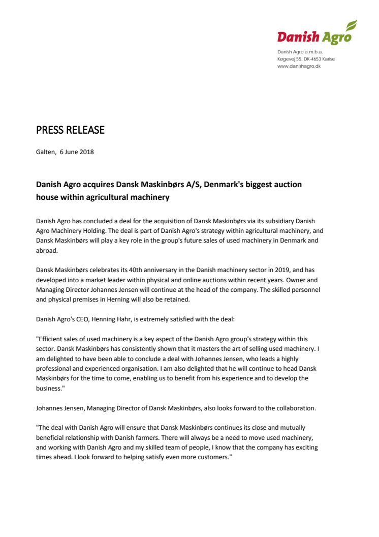 Danish Agro har via dotterbolaget Danish Agro Machinery Holding A/S ingått ett avtal om köp av auktionverksamheten Dansk Maskinbørs A/S. Köpet är en del av Danish Agros strategi i maskinbranschen och Dansk Maskinbørs A/S kommer få en nyckelroll i koncernens framtida satsning på begagnade maskiner i Danmark och internationellt.