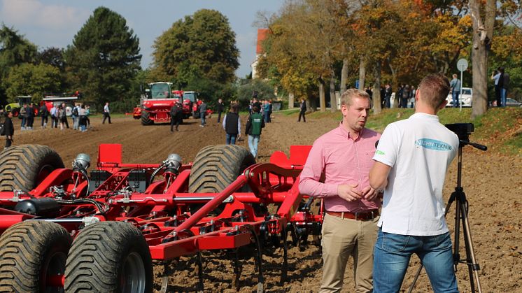 Daniel Andersson, produktansvarig för HORSCH intervjuas av Filip Niléhn​ från Lantbruksnytt. Foto: Melissa Dahlqvist