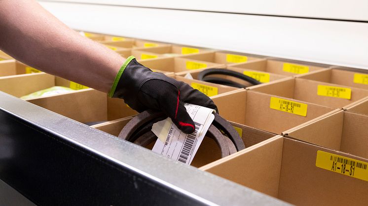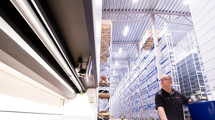 • Lagerarbetaren Lars Helgesson lägger in delar i hissautomaten.