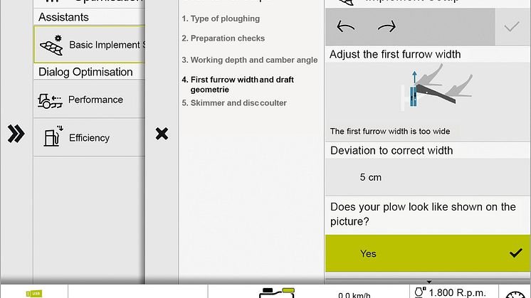 A further function of CEMOS for tractors is to assist with the basic implement settings. This step alone can have a positive impact on fuel consumption, wear, throughput and work quality. Here too, CEMOS for tractors guides the driver step-by-step by making clear recommendations. When ploughing, for example, this may involve adjusting the working depth, front furrow, pull point and pull line or making sure that the skim coulter is at the correct height. Explanations and diagrams of the implement help determine the right settings for a particular situation.