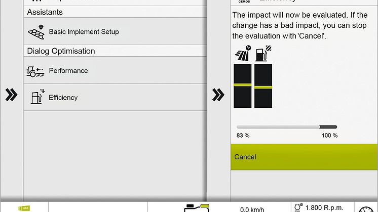 The driver can invoke the optimisation dialogue at any time during operation. CEMOS for tractors then actively assists by making further suggestions to improve the performance of the tractor-implement combination. It offers the driver a choice of optimisation goals; either maximum throughput or optimum fuel efficiency. Once the driver has made his selection, the system determines the current status, then guides the driver through the optimisation process by asking simple questions. After every change to the settings, the driver can check the results on the screen and decide whether to apply the new setting or return to the previous setting.