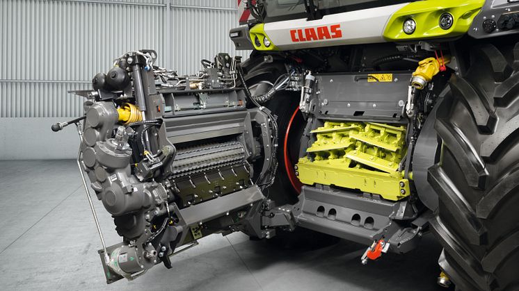 Istället för kedjedrivning överförs den mekaniska kraften via kraftuttag och växellådor. Med sitt konstanta hydrauliska förpressningstryck säkerställer inmatningsskruven ett jämnt flöde av gröda till matarenheten. Dessutom säkerställer ACTIVE CONTOUR-styrningen i kombination med den svängarmsmonterade pick-upen optimal markföljning och därmed förlustfri skörd även vid höga framkörningshastigheter.